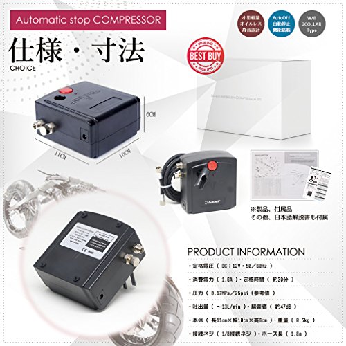 - ●コンプレッサー基本仕様 【定格電圧】DC:12V(50/60Hz) 【消費電力】1.6A 【定格時間】約30分 【最大圧力】0.17MPa/25psi(参考値) 【吐 出 量】~13L/min 【騒 音 値】約47dB 【本 体】長11cm×幅10cm×高6cm 【重 量】0.5kg 【接続ネジ】1/8接続ネジ 【ホース長】1.8m ●セット内容 ・コンプレッサー本体 ・エアホース(1.8m) ・エアブラシスタンド ・他、付属品一式に日本語解説書も同梱 ※「DIVENT」ブランドは商標出願中です。