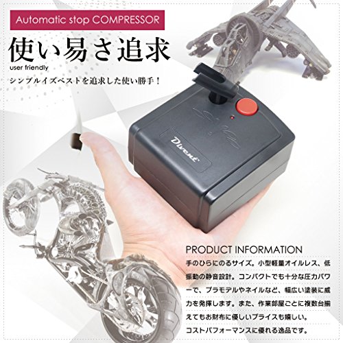 - 小型、静音、オイルレスで、ダブルアクションやトリガーアクション等の、ノズル口径0.2mm、0.3mm、0.5mmを主な用途とする、ネイルから一般的なプラモデルなどのホビーユースにも適しており、初心者をはじめ、出先のスプレーワークとしても家庭用としても兼用でき、気軽にエアブラシ塗装が楽しめる設計の、エアブラシコンプレッサーです。