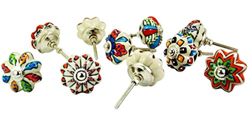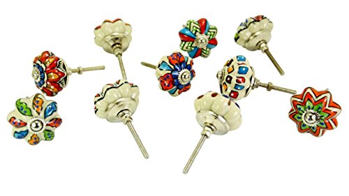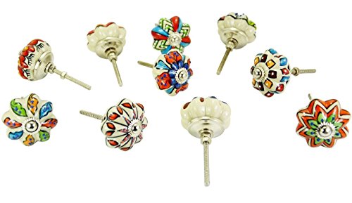 Product Type - Drawer Pulls / Knobs Diameter Of each Knobs - 1.75" (inch) Round Depth Of each Knobs - 1.5" (inch) Color - Mix Color Design- Blue,Pastel red & White Dotted Multi Stylish Designed Like Pictures Materials - Ceramic Quantity - 10 Pieces Comes With- Chrome Head Cap , 3.25" Long Screw , Washers and bolts For each knobs... Note - The Brass hardware required to install comes standard with each knob. Installation Process Of the Knobs 1- Just drill an 1/8 " hole in the cabinet door and tighten the nut with a spanner. 2- This exquisite ceramic door knob is hand made in Rajasthan, India by skilled artisans. 3- The blue pottery of India is famous throughout the world for its quirky cheerful designs. 4- The wide variety allows you to accessorize to your hearts content. Product Type- Ceramic Handmade Drawer Pulls / Knobs With Chrome Hardware ,
