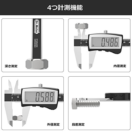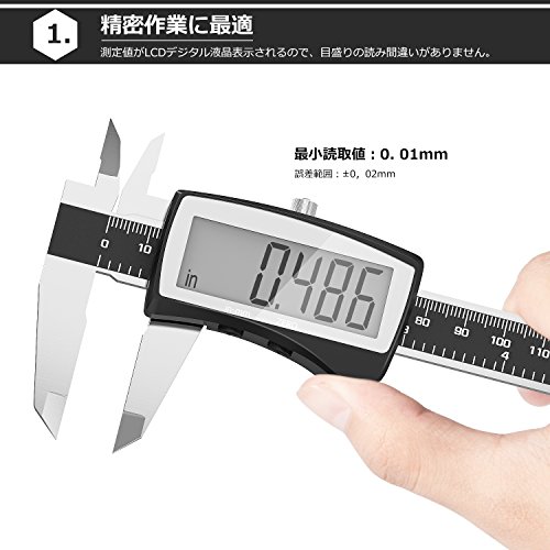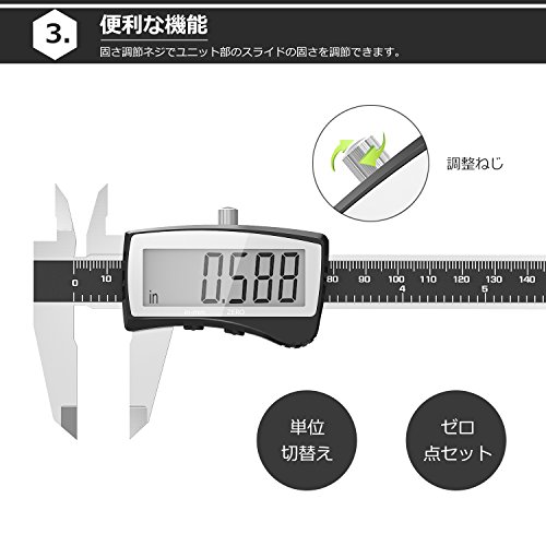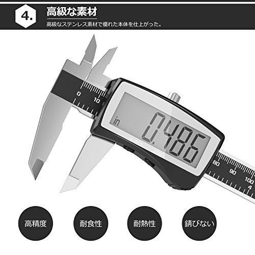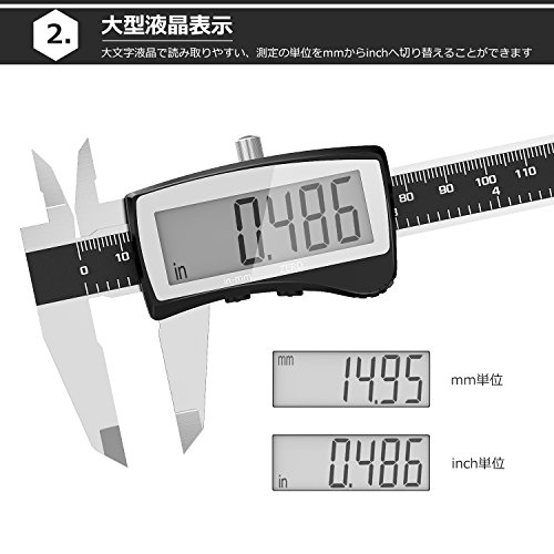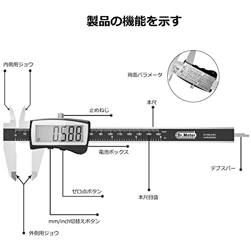 多機能:外径、内径、深さ、段差などを簡単かつ正確に測定できます. ▲高精度:親指ホイールは微調整でき、スムーズな滑りや正確な位置決めが保証できます。 ▲高品質:耐久性のステンレス製キャリパーは寿命を延ばすことができ、ロックつまみが揃え、締め付けるなら簡単に数値を固定できます。 ▲利便性:液晶表示部が見えない場所での測定に便利なホールド機能付くのほか、小型で持ち運びに大変便利です。