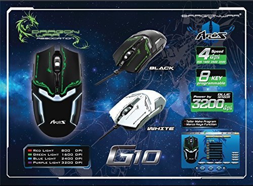 DRAGON WAR ELE-G10 ARES BLUE-SENSOR GAMING MOUSE Product Code: ELE-G10 (Black /White) Features: Assign your choice of key gaming action to programmable buttons to create your own customs profiles Special gaming blue sensor with revolutional 3200 dpi Adjustable resolutions 800, 1600, 2400 and 3200 dpi Gaming mouse with 6 control buttons 8 Programmable keys Power-related features power source USB High-speed USB 2.0 PC connectivity LED Light Gold-plated USB Connector for a Reliable Transmission Integrity Mouse cable length 1.8 meters Suitable for almost every surface Weight-in design Dragon-mode Bungee Ergonomic design for professional gamer Extras supported operating system Windows 8/ Windows 7/ Windows Vista/ Windows XP/ Windows 2000/ Windows ME/ Windows 98