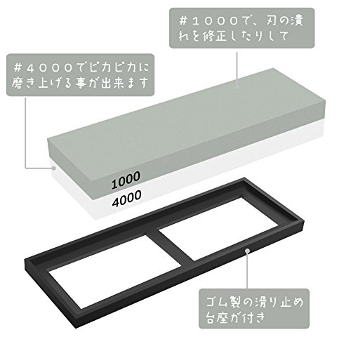 - 多機能: 両面が#1000と#4000という組み合わせが絶妙です。#1000で、刃の潰れを修正したりして、最後に#4000でピカピカに磨き上げる事が出来ます。#4000で磨けば、切れ味も抜群です。