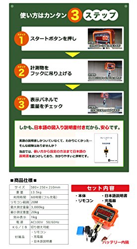充電式リモコン付きデジタルクレーンスケール3t(3000K)の解説 トップクラスの品質を誇る吊り下げ式吊秤(はかり器)をお届けいたします。 充電式ですのでどこでも計測、計量が可能です。また電子式、デジタル表記で計測結果も一目瞭然。 日本語のマニュアルも 同梱させて頂いておりますので簡単にご使用できます。 初めて量り、計測器を導入される方も安心です。 充電式リモコン付きデジタルクレーンスケール3t(3000K)の詳細 仕様:吊りはかり(ツリハカリ) 型番:JL-H-3000 最大測定重量:3000K 最少測定重量:1K 刻み表示:1K 電 源:AC100V (50/60Hz) サ イ ズ:58cm×25cm×21cm(13.5kg) 仕様:防水・防塵 付属品:リモコン、充電器、日本語説明書 種別:デジタル 充電式 クレーンスケール 吊り下げ 吊りはかり 吊秤