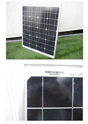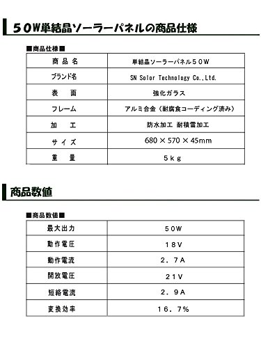ソーラー発電用 50Wソーラーパネル(12v)(太陽光パネル・太陽パネル)の仕様 ・商品名:単結晶ソーラーパネル 50W ・ブランド名:SN Solar Technology Co., Ltd. ・最大出力:50W ・動作電圧:18V ・動作電流:2.7A ・開放電圧:21V ・短絡電流:2.9A ・フレーム:アルミ合金 ・サイズ :680×570×45mm ・重量 :5Kg ・防水、防滴、防雨 ソーラー発電用 チャージコントローラー12Aの仕様 ・商品名:チャージコントローラー 12A ・機能:12vと24v自動認識 ・防止機能:過充電防止機能・過放電防止機能・逆流防止機能・電圧保護 ・対応パネルw数:12v(144wまで)・24v(288wまで)対応 ・サイズ :120×100×60mm ・重量 :200g ・防水、防滴ではありません。