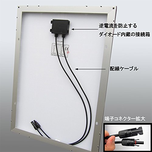 ソーラー発電用 50Wソーラーパネル(12v)(太陽光パネル・太陽パネル)の解説 自作に最適なソーラーパネルです。 ソーラー初心者の方も安心の日本語取り付けマニュアルも 同梱させて頂いております。 小型で省スペースに設置可能なため、ご家庭やご自宅のベランダなどにDIY感覚で太陽光電池(ソーラー電池・太陽電池)として簡単に設置可能です。 災害時や非常用以外にも、屋外、外での電源として、お庭のイルミネーションや外で使われる井戸や船(船舶・クルーザー)、自動車やキャンピングカーなどでもご利用いただけます。 初めて太陽光発電、自家発電にチャレンジする方も安心です。 非常用や節電、エコに取り組む方に大好評いただいているソーラーパネルで ソーラー発電機(太陽光電池発電機)を構築してみませんか? 単結晶ソーラーなら高出力のため、太陽光をぐんぐん吸収して効率よく発電してくます。この楽しみを ぜひ味わってみてください。