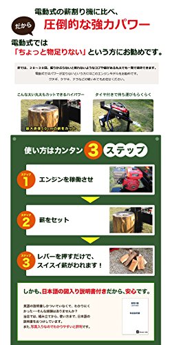 縦横兼用で大きな丸太も簡単破砕の26トンモデルの薪割り機(まき割り機)をお届けいたします。 電気を必要としないエンジン油圧式ですのでパワフル且つ屋外での使用にも大変便利です。 26トンの強力な破砕力をぜひお試しください。 日本語のマニュアルも 同梱させて頂いておりますので簡単にご使用できます。 初めて薪割り機を導入される方も安心です。 薪割機で薪ストーブ(まきストーブ)や暖炉の準備を簡単に済ませてみませんか? エンジン油圧式26tモデル薪割機(薪割り機)の 詳細 仕様:エンジン油圧式ログスプリッター 型番:LS27t 破砕方式:縦横兼用 破砕力:26T 馬力:6.5馬力 駆動方式:ガソリンエンジン 4ストローク 破砕できる木材:杉、ヒノキ、桜、クヌギ、樫(カシ)、クヌギなど 破砕最大寸法:直径50cm 長さ62cm サイクルタイム:16秒 コントロールバルブ:オートリターン方式 コントロールハンドル数:ワンハンドル けん引対応:2インチボールヒッチ、チェーン オイルタンク容量:24L ポンプ容量:16L/min オイルシリンダー直径:10cm 本体サイズ:縦225×横110×高さ125cm(250kg) 梱包時サイズ:縦220×横58×高さ58cm