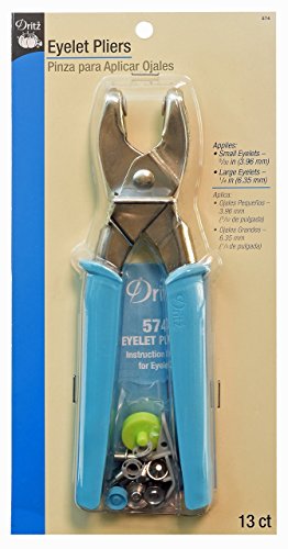Dritz Eyelet Pliers are an easy-to-use tool for the application of small and large eyelets. These styles of eyelets are used on belts, shower curtains, tote bags, purses and garments. Use the eyelets to create laced effects on clothing and costumes. Eyelets can be applied to heavy paper for scrapbooking and card making. The Eyelet Pliers will apply Dritz 5/32” (3.96 mm) small eyelets, and ?” (6.35 mm) large eyelets. The pliers package contains 1 pair of pliers, 8 tools, 1 tool remover, 2 replacement inserts, and illustrated instruction guide. Warning: Small parts. Keep away from children under 3 years old. NOT A TOY.