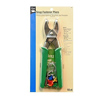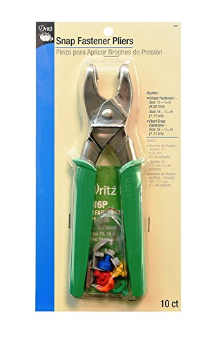 Dritz Snap Fastener Pliers are an easy-to-use tool for the application of snap fasteners. This style of snap fasteners is used on children's wear, blouses and shirts. The Snap Fastener Pliers will apply Dritz 3/8' (9.52 mm) snap fasteners, Dritz 7/16' (1.11 cm) snap fasteners, and Dritz 7/16' (1.11 cm) pearl snap fasteners. The pliers package contains 1 pair of pliers, 5 tools, 1 tool remover, 2 replacement inserts, and illustrated instruction guide. Warning: Small parts. Keep away from children under 3 years old. NOT A TOY.