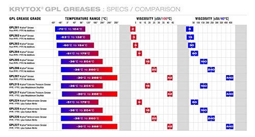 Krytox GPL224 Grease has the best properties for corrosive environments and extreme pressure applications. Useful temperature range: -51C thru 179C. Base Oil viscosity, 9cSt @ 100 C / 18cSt/40 C. Oil separation from grease, wt loss, % per 30hr @ 99C = 4. NLGI Grade 2. Krytox GPL224 contains Sodium Nitrite for highly corrosive environment applications and can be used on components that may come in contact with all chemicals including acids, bases, solvents and other reactive chemicals. Typical applications include valves, bearings, seal barrier fluids, instruments and oxygen systems. Additionally, Krytox Grease is compatible with all elastomeric seal materials and engineering plastics. See Krytox Greases GPL202 through GPL207 for applications that require higher temperature ranges and high viscosity needs. See Krytox Greases GPL215 and GPL217 for slow speeds or extreme pressure applications that require molybdenum disulfide additives. See Krytox Greases GPL224 through GPL227 for high pressure, highly corrosive environments such as automotive bearings, sealed pump bearings, and electric motors bearings that require anti-corrosion/anti-wear additives. Krytox Grease provides exceptional performance, stability, and reliability in the toughest conditions ? to maximize productivity and equipment life. Krytox Grease is undamaged by, and non-reactive with, acidic or caustic cleaners and disinfectants, steam, moisture or high temps. Krytox Grease is non-toxic, has no chlorine content or hazardous VOC materials, is odorless and silicone-free in formulation.