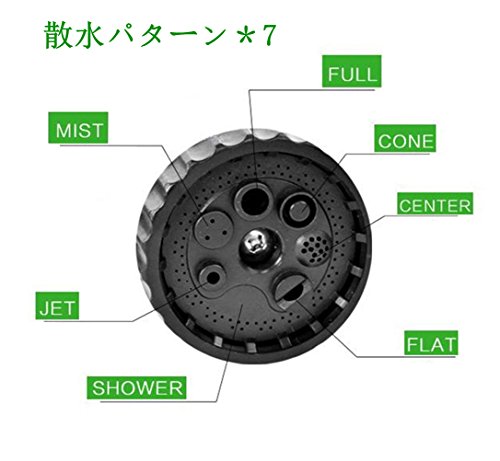 「散水パターン」散水ノズルは7種類の散水パターン( Flat/ center/ cone/ full/ mist/ jet/ shower )があり、水量を調節できので、効率的に水やりできます。ガーデニング、掃除、洗車、ペットのシャワーなど様々な用途に合わせて使い分けできて便利です。