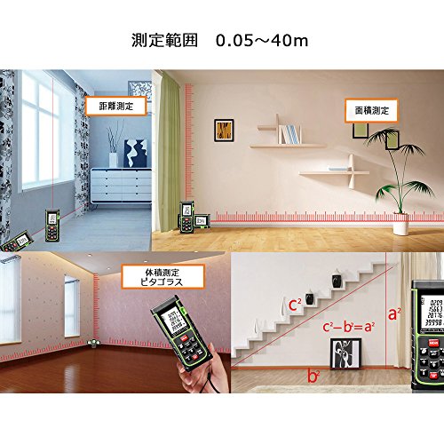- 多種の測定モード:単一距離測定、連続測定、面積測定、体積測定、ピタゴラス(辺測定)、幅測定範囲は0.05~40mです。
