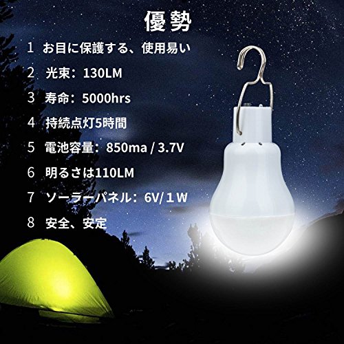- 【アウトドア・インドアで大活躍】ソーラーパネルと照明が分離型ので、屋外、屋内、どちらでもご使用いただきます。一方ではキャンプ、バーベキュー、夜釣り、山登り、玄関や廊下や東屋や楼閣などの足元を照らす用にも便利なソーラー電球です。読書も大丈夫です。他方では停電・災害時の非常灯、緊急時に応急照明にも役に立ちます。6ヶ月の品質保障付き、万が一商品に不具合がある場合、弊社にご連絡いただければ迅速に対応いたします。