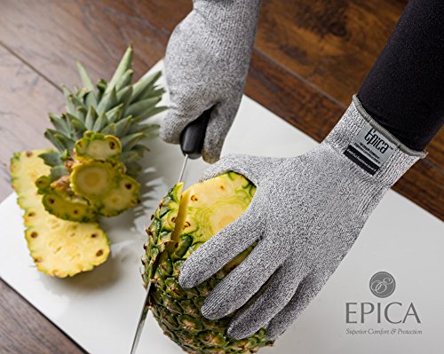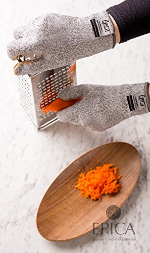 - 厳しい安全基準とパフォーマンス検査:Epicaのグローブは耐切創性レベル5の基準を満たしており、鋭いナイフやマンドリンカッターを使用している時、またガラスや道具を使っている時でも、手、指、手首は安全なので、安心してご使用になれます。