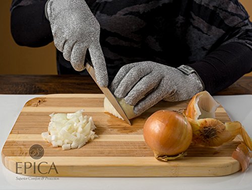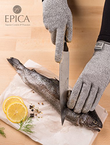 Epicaグローブはキッチンでの事故を低減するのに大いに役立ちます。ピーラー、おろし金、マイクロプレンを使用する時に着用することで、ちょっと手を滑らせてケガをする心配はもうありません。工場での機械による切削や摩耗作業にも必要不可欠です。ガラスの取り扱いや切断にも最適です。
