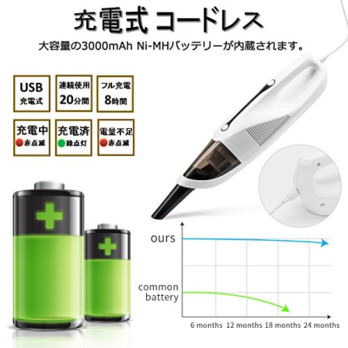 - 【充電式コードレス】3000mAhの大容量ニッケル水素バッテリーが内蔵され、一回のフル充電で20分間の連続稼動を実現しました。microUSBケーブルで充電なので、パソコンとカーチャージャーで充電できます。コードレスなので、本当どこでも持っていけますよ!