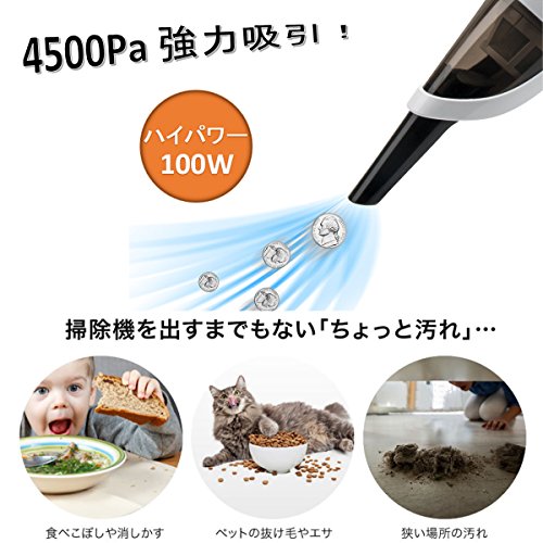- 【パワフルな吸引力】コードレスクリーナーなのに、100Wのハイパワーで約4500Paの強い吸引力があります!子供の食べ滓、髪の毛、ペットの毛、ホコリ、車内の砂や小石などはもちろん、コインも強力的に吸い込むことができます。
