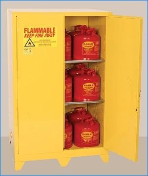 The Eagle Model 1947 Legs Safety Cabinet has all the great features Eagle is famous for, plus the aesthetic and functional benefit of 4 inch legs. Now you can place cabinets over HVAC floor or baseboard vents, clean easily under cabinets, straddle uneven floors, wires or plumbing and increase ventilation to reduce possible corrosion. Each leg is adjustable to balance and level cabinets. Cabinets meet OSHA and NFPA Code 30. Yellow finish only.