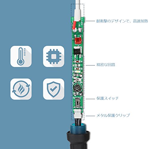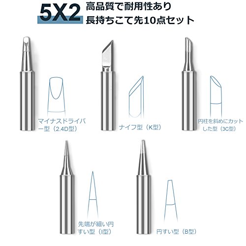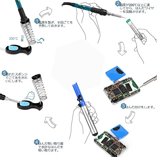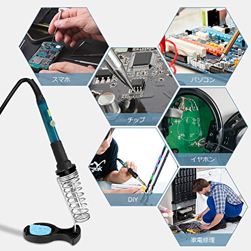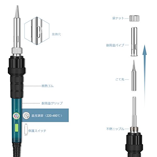- PSE認証あり。セット内容:はんだごて本体、こて台、はんだ吸い取り器、はんだワイヤ、ピンセット、曲線ピンセット、スポンジ、溶接補助工具、形状の異なるコテ先が5本*2セット、収納ケース。使い勝手がよく非常に助かります