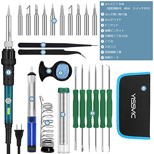 はんだごて YISSVIC 電気はんだごて 10-in-1 60W 110V 温度調節可能(200~480℃) PSE認証 スイッチ付き 10個交換コテ先付き 収納ケース付き 精密半田ごて はんだ付け 電子作業用 電子DIY用 基盤用【24ヶ月保証】