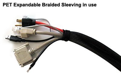 Great for automotive, computer and electronic applications. PET Expandable Braided Sleeving can be easily installed on various cables and wires, even ones with large connectors. When fully expanded the diameter gets up to three times bigger then normal. This sleeving is flexible and has high tensile strength.