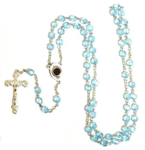 CRYSTAL CLEAR LIGHT BLUE BEADS With SILVER PLATED ROSARY CROSS and HOLY LAND SOIL MARIA ICON [並行輸入品]