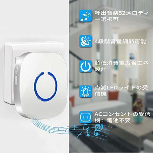 - 【ボリューム4段階・52曲のメロディー選択可能】親機&子機セットチャイムは呼び出し音が52種類あって自由に選択可能、選択可のボリュームは25db~110dbまで4段階のレベルがありま す、多種多様の環境と要求を満たします。高齢者や妊娠中の女性のために、彼らは単に送信機が家族の残りの部分にSOS信号を受信することができます。