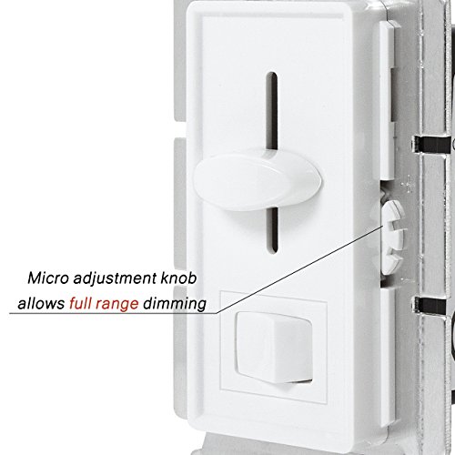 Single pole and three-way, 150-Watt Dimmable CFL and LED Bulbs, 700-Watt Incandescent/ Halogen Bulbs. ETL Listed. Enerlites 59302 Slide Dimer Switch, Single Pole, Three-Way. The best way to enjoy energy efficiency at home and offices meanwhile to meet the lighting need for different occasions is to replace the standard light switch with Enerlites Model 59302 light Dimmer Switch. Adjusting the slider up and down, you have full range light dimming control and the light level change smoothly. The design of the light tuning wheel on the left of the product is to achieve ideal lighting level control on different bulbs. This universal dimmer switch works perfectly with dimmable compact lamp CFL, LED, incandescent and halogen bulbs including bulbs from brand Philips, Sylvania, GE and Cree. Enerlites Lamp Dimmer model 59302 is a great energy saving solution without sacrificing lighting performance. It is a lifestyle product as with it, you can create different environment for different occasions. Dimming your lights by a quarter increases your savings by approximately 20 percent. • 120VAC. • Incandescent / Halogen Lighting up to 700W • Dimmable CFL / Dimmable LED 150W.