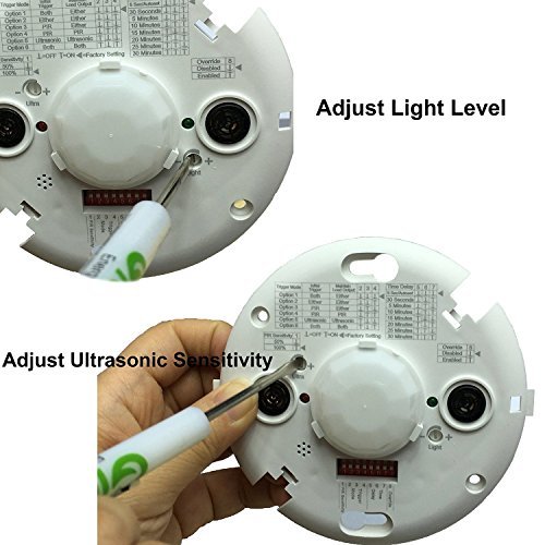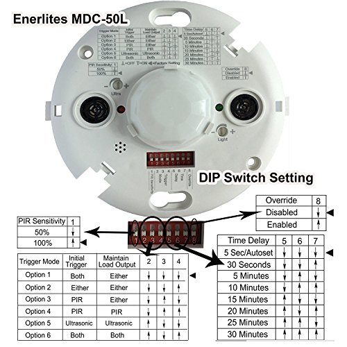 Enerlites MDC-50L 360° Ceiling Sensor Dual-Technology utilizes the benefits of advanced passive infrared (PIR) and ultrasonic technologies to provide 360 degree accurate occupancy detection on a coverage range of 1600 sqft for PIR and 1000 sqft for Ultrasonic sensor. The ceiling sensor is designed for a CEILING HEIGHT of about 8-10 FEET. Application of duel sensor technologies in one sensor helps to avoid false triggering. MDC-50L has multi-level, 360° Fresnel lens for superior occupancy detection. The 360 degree commercial grade ceiling sensor allows 6 detection mode options so users can set to trigger ON when both PIR and Ultrasonic sensor detect occupancy or either PIR or Ultrasonic sensor detects motion; The light turns OFF automatically when no motion was detected for the set delay time by both of the sensor technology or either of them depending on user's setting. Time delay set: 5sec/autoset, 30 sec, 5min, 10 min, 15 min, 20min, 25 min and 30 min; Ultrasonice Sensitivity is adjustable through turning sensitivity adjustment trimpot; PIR adjustment: 50% or 100%; Ambient light level adjustable: 100Lux to dailight by turning clockwise the trimpot; Override all sensor functions is easy to set by switch DIP #8. Enerlites MDS-50L 360 degree dual-tech ceiling sensor is ideal lighting control, energy efficiency and security solution for offices and other commercial areas. ATTENTION: This MDC-50L Operated on 24V supplied by MPP-24 Power Pack. Mounted on the ceiling of a closed office off-center area, should stay away from door opening area to avoid detecting people passing by, and should stay 4 feet to 6 feet away from air supply ducts to avoid false activation. Open Office Area Coverage: To get complete coverage in an open office area, install multiple sensors so that there is an overlap with each adjacent sensor's coverage area