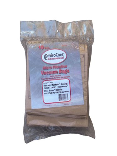 Karcher Tornado and NSS Pacer Vacuum Cleaner Bags Allergy Vacuums Each manufacture package includes 10 MicroFine Electrostatic lined Allergen Vacuum Bags made by EnviroCare Part #ECC174 Contact me if you are interested in larger wholesale quantities of this or other products.Envirocare Parts designed to fit with or replace genuine original (OEM) manufacture part numbers below: 6.904-309.0, 6.904-305.0, 6.904-294.0 , Janitized Part #FJAN-KACV30-2, Cleanbreeze, 9533091, 9.533.091.0, NSS Pacer #7190461, K6904305, K6904294) or 300 (K6904303), K6904301 reusable Cloth Bag Designed to fit the vacuum models listed below and more: Karcher, Tornado, NSS Pacer Commercial Vacuums: Style Model Numbers Karcher/Tornado CV30, CV30/1, 1.023-101.0, 1.023-109.0 CV38/1, 1.435-101.0, 1.435-107.0, CV38/2, 1.033-315.0, 1.033-321.0, CV38 Dual, 91415 CV48/1, CV48 Dual, 91419, CV48/2, 1.057-310.0, 1.057-315.0, DUST CLASS M NSS Pacer 112 - 115UE (30cm & 38cm single motor) Dimensions: 4.1cm Hole Diameter 33cm x 6 1/2" Bag Size 10cm x 3 1/2" Cardboard Traps and seals-in 99.7% of dust mites, pollens, ragweed, mould spurs, microscopic particles, bacteria, dust mites, germs as small as 0.1 micron, other allergy causing agents, and 99.9% of pet dander.A must for Allergy Sufferers!