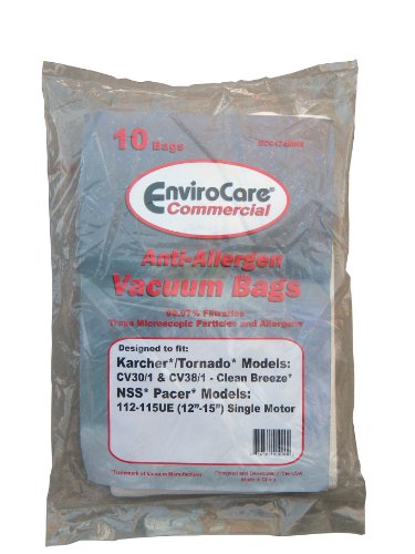 Karcher Tornado and NSS Pacer Vacuum Cleaner Bags Allergy Vacuums Each manufacture package includes 10 Cloth-like HEPA Allergen Vacuum Bags made by EnviroCare Part #ECC174MNS, Contact me if you are interested in larger wholesale quantities of this or other products.Envirocare Parts designed to fit with or replace genuine original (OEM) manufacture part numbers below: 6.904-309.0, 6.904-305.0, 6.904-294.0 , Janitized Part #FJAN-KACV30-2, Cleanbreeze, 9533091, 9.533.091.0, NSS Pacer #7190461, K6904305, K6904294) or 300 (K6904303), K6904301 reusable Cloth Bag Designed to fit the vacuum models listed below and more: Karcher, Tornado, NSS Pacer Commercial Vacuums: Style Model Numbers Karcher/Tornado CV30, CV30/1, 1.023-101.0, 1.023-109.0 CV38/1, 1.435-101.0, 1.435-107.0, CV38/2, 1.033-315.0, 1.033-321.0, CV38 Dual, 91415 CV48/1, CV48 Dual, 91419, CV48/2, 1.057-310.0, 1.057-315.0, DUST CLASS M NSS Pacer 112 - 115UE (30cm & 38cm single motor) Dimensions: 4.1cm Hole Diameter 38cm x 9 1/2" Bag Size 10cm x 3 1/2" Cardboard Traps and seals-in 99.7% of dust mites, pollens, ragweed, mould spurs, microscopic particles, bacteria, dust mites, germs as small as 0.1 micron, other allergy causing agents, and 99.9% of pet dander.A must for Allergy Sufferers!