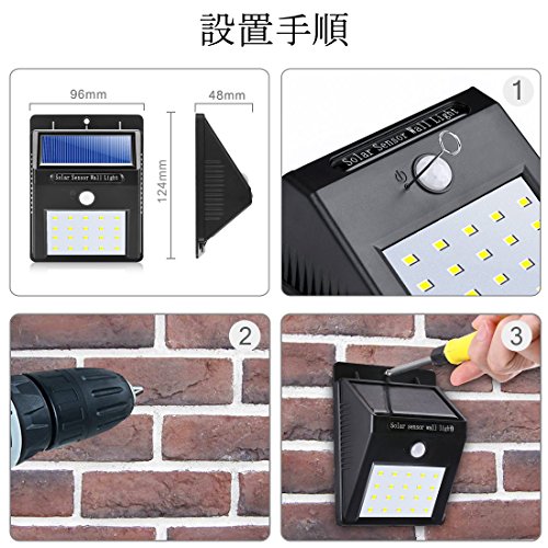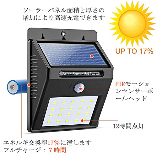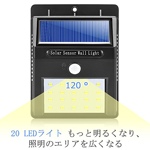 - 高輝度20LEDライト:センサーライトはLEDを20個搭載しますので、より明るくなって、センシング距離も3メートルに達します。耐久性が強く、50000時間の寿命を持つLEDがあり、頻繁なメンテナンスや交換のを減らします。夜間にパーク、ベランダ、ポスト、ガーデン、縁側、ガレージなどを照らし、素敵な照明効果を提供して、足元の安全及び防犯効果に大活躍!