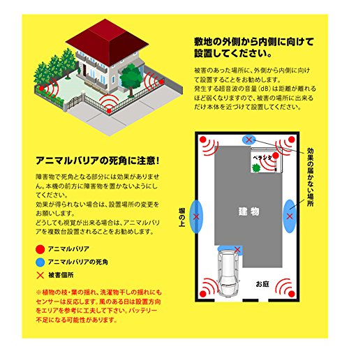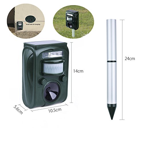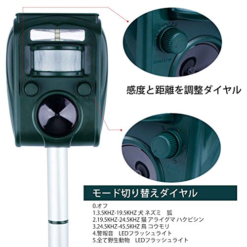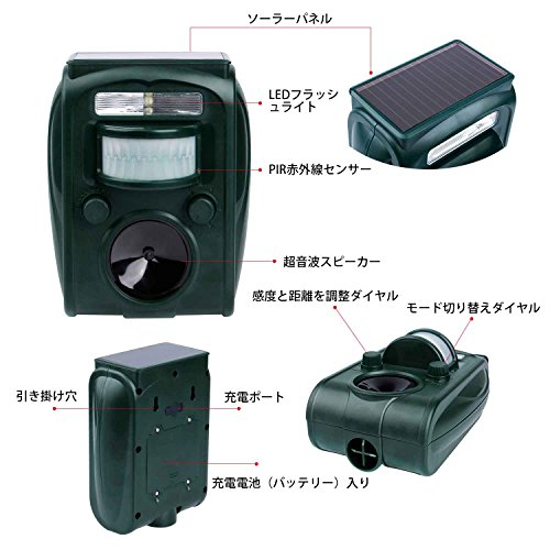 - 害獣駆除の最高基準モデル:害獣、害鳥をLED強いフラッシュライトと超音波で猫よけ!最新のPIR赤外線センサーで害獣などをしっかり感知して見逃さない。犬、ネズミ、狐、ハト、カラス、コウモリ、アライグマ、ハクビシンげっ歯類なども対応可能。動物を怪我させずに追い払うソーラー式動物撃退器です。
