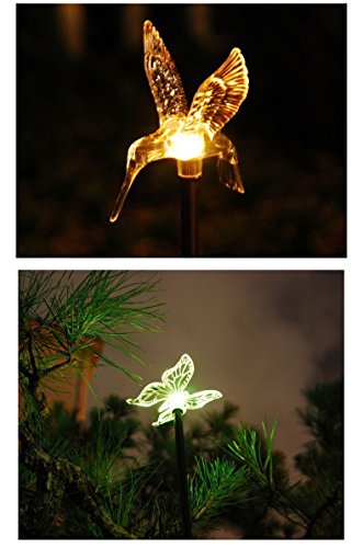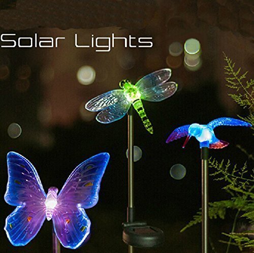 Esky? - Sky of Electronics Decorate your garden with this solar light set. The set comes with a dragonfly, butterfly, and hummingbird shaped stake light with color changing LEDs. The colors change from red, green, to blue.? Specifications: -Utilizes solar energy to charge the 1.2v/600mAh built an AA-type rechargeable batteries. - The LED lamp colors change from red, green, to blue.? - "On" switch enables automatic activation of light at night;? - "Off" switch disables the light. - Water resistant casing to prevent damage? - Product overall height 70CM Package Includes: - 1* Esky Butterfly Solar Light with stake - 1* Esky Hummingbird Solar Light with stake - 1* Esky Dragonfly Solar Light with stake - 1* Warranty Card? Seller Warranty Description:? - 12 Month Replacement Warranty - 30 days Money Back Guarantee - Lifetime Support Guarantee