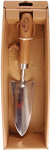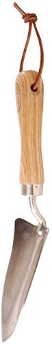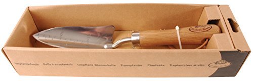 Transplanter Tool in stainless steel with a comfortable wooden handle. Leather loop for hanging and storage.
