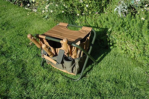 Compact and sturdy, this portable canvas tool bag and stool will make gardening a breeze! Attractive green and brown earth tones make this a beautiful and practical piece of equipment. Plenty of pockets to keep all your necessary gardening tools within reach and a canvas stool to keep you off the ground while weeding, planting or doing almost anything you do to beautify your garden.