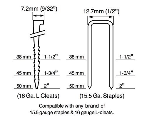 - The flooring nailer uses 16 Gauge L-Cleats from 1-1/2" to 2" long and 15- ½" Gauge ½" Crown Flooring Staples from 1-1/2" to 2" Long. Interchangeable base plates let you install 3/8" - 3/4" solid hardwood including cherry, oak, maple, walnut and other nail down tongue and groove flooring