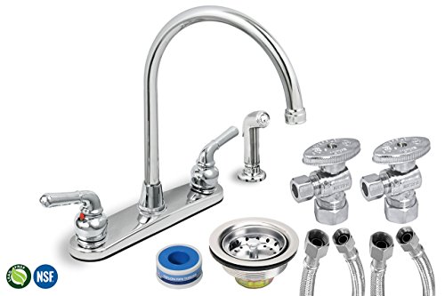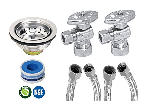 1- stainless Steel sink strainer. This complete kitchen faucet installation kit give you everything you need to install the included faucet. With the two-handle kitchen faucet offering symmetric styling and steadfast performance. The high-arc design of its swivel spout allows you the flexibility and reach to fill modern cookware. This kitchen faucet features two lever handles, 1/2-Inch ips connections, lead-free waterways, reliable washer less cartridges, a matching spray and a Deluxe Chrome finish.Includes:1-kitchen faucet2-supply lines2-angle stops1-sink strainer.