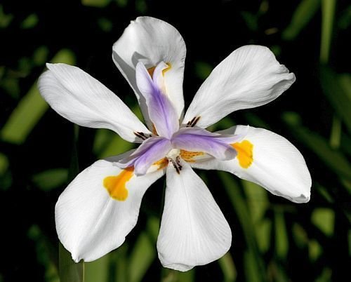 ?Dietes iridioides, called cape iris is an evergreen perennial herb to 60 cm high, with a creeping rhizome. Leaves sword-shaped, in a loose fan, dark green. Flowers of Dietes iridioides subtended by sheating bracts, each lasting a single morning, white with the inner petals often marked with brown streaks near the base and the style branches lightly flushed with violet, 30 - 40 mm diameter. Photos from Uni Bochum.