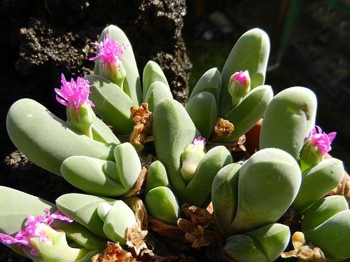 Gibbaeum shandii is a dwarf, cushion forming succulent, up to 5 cm tall and about 8 - 12 cm wide. The body resembles a sharks head. The flowers are daisy-like, striking purple or pink and long lasting.