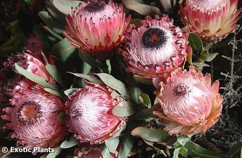 ?Protea magnifica, called queen protea is a 8-10 feet tall and wide shrub. The color of the flowers range from soft pink, deep rose to strong red. The flowers of the Queen Protea last for a very long time and look great in dried flower arrangements. Frost tolerant. USDA zone 8.