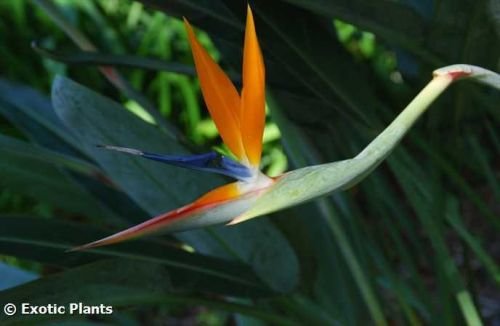 ?Strelitzia reginae Mandela's Gold, the yellow bird of paradise flower is a stemless, evergreen perennial shrub. The leaves are gray-green, banana-shaped and grow to a height of about 1.5 meters. The structure and pollination of the flowers is fascinating. The flower is at right angles to the stem, and gives the appearance of a bird's head, hence the name Bird of Paradise flower. Each spathe contains 4 to 6 flowers. Each flower consists of 3 yellow sepals and 3 dark purple petals.