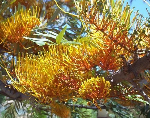 ?Grevillea robusta, also called silver oak is a large evergreen tree 18-30 m high with a straight trunk and moderately spreading crown. Leaves: Dark green above, grayish-white or rusty-silky beneath, two-pinnatifid, deeplyincised, fern-like, 150-300 mm long, leaflet margins recurved. Flowers: Golden-orange, stalked, 20-30 mm long, in terminal, bottlebrush-like sprays80-150 mm long. Fruits: Brownish-black, leathery follicles about 20 mmlong, containing one or two flat, winged seeds.Habitat/ecology: This large, evergreentree has been used extensively in reforestation programs. The leaves produce anallelopathic substance that inhibits the establishment of all species, includingitself apparently. It grows well in dry areas between 350-1,600 m.Native range: Eastern Australia.