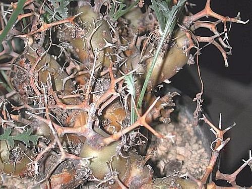 ?Pelargonium crithmifolium, called samphire-leved pelargonium is a succulent perennial shrublet (caudiciform). The stems are thick and fleshy with knobs on them, and greenish yellow with peeling bark. Pelargonium crithmifolium is summer deciduous. The plant is able to photosynthesize through its greenish bark. This unusual characteristic is seen in a number of other summer deciduous plants from the arid winter rainfall areas. It is nature's way of surviving the dry summer heat. The succulent leaves are usually tightly bunched together on the tips of the branches. They are pinnately divided (divided into smaller leaflets). The leaves, when crushed, have a ginger and nutmeg smell. Flowers are produced in umbels of normally 4 to 8 at a time. Flowering time is in spring.