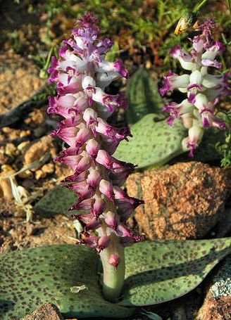 Lachenalia carnosa is native to the Namaqualand in south-west Africa. It has two bright green ovate leaves with depressed longitudinal veins on the upper surface. Lachenalia carnosa has attractive flowers in colours of blue, green, white and magenta.