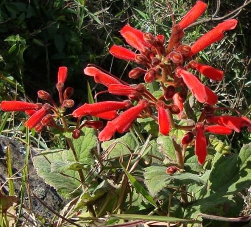 Sinningia magnifica is native to Brazil. The caudex can grow up to 10 cm, and the whole plant can reach a height of 40 cm. The flowers are dark orange to red.