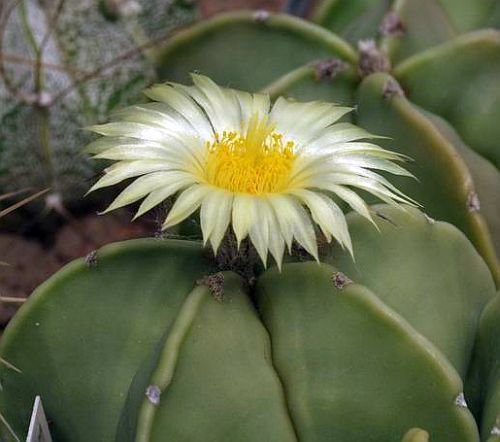 ?Astrophytum niveum v. nudum, native to Mexico with green ripped body. Yellow flowers with red centre.