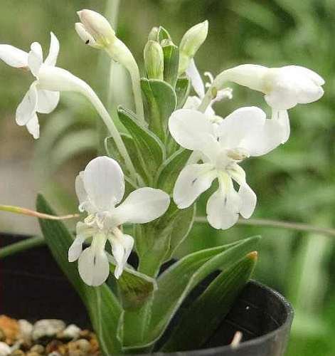 ?Lapeirousia pyramidalis ssp. pyramidalis is native to Namibia and South Africa. The flowers are cream to bluish. It forms a pyramid shape in bud with tightly packed blue green bracts.