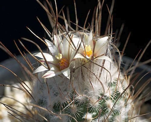 ?Turbinicarpus dickisoniae, a small cactus about 3 cm high and 4 cm wide, dark greyish-green, endemic to Mexico. Areoles with long white wool. Flowers white-yellow with brown midstripe, 1.5 cm wide.