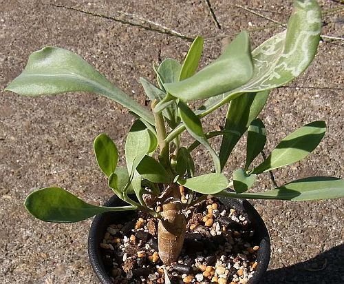 ?Othonna macrosperma, a caudiciform native to southern Africa. The caudex grows up to 14 cm in diameter and the entire plant grows 45 cm tall. The flowers are yellow.