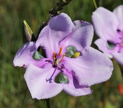 Aristea biflora is native to South Africa. It has large lilac to purple flowers with transparent to translucent bronze windows on the lower margins.